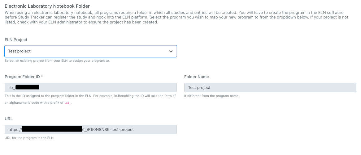 You can associate Benchling projects with Lab Atlas projects when creating them. Fill in the New Project form information as normal, then at the bottom of the page, under the 'Electronic Laboratory Notebook Folder' section, select your Benchling project from the 'ELN Projects' dropdown. This will fill in the appropriate information to allow Lab Atlas to connect to your Benchling project when creating studies.