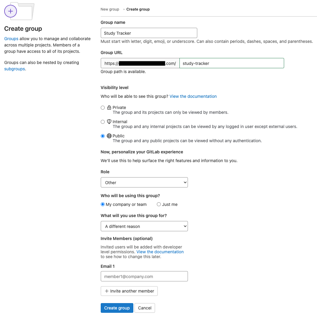 This needs to be done by an administrator. Give your project a clear name. Be thoughtful about how you set the Visibility Level of the group. For private GitLab instances, to ensure that projects are accessible to colleagues who do not have GitLab licenses, you should set the Visibility Level of the group 'Public'. For hosting on GitLab cloud, it is probably not wise to make your study projects available to the public internet.