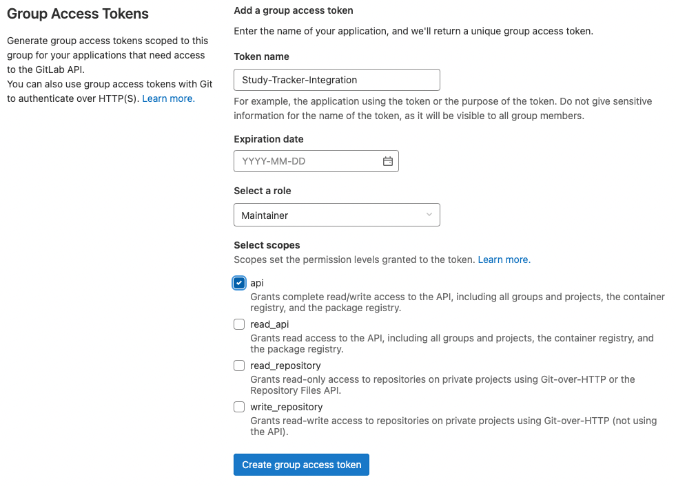 On the next screen, give your token a name and set an expiration date some time in the future (be sure to create a reminder for yourself to refresh the token). From the list of scopes, check 'API'. Click 'Create token'. On the next screen, copy and save the secret token.