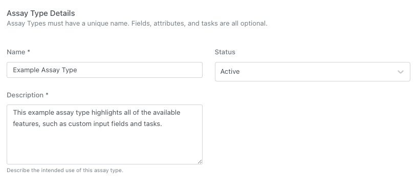 Assays in Lab Atlas represent the smallest unit of work, typically some repeatable work that might be done in a wet lab or data sciences environment. Assay Types are a simple way for differentiating between the types of work being done in different assays and a means of creating templates for work that needs to be documented. They allow you to add additional depth to assays by incorporating some features that enable customizing workflows tailored to your organization: custom input fields and tasks. Input fields allow capturing additional information in a variety of inputs when creating new assays. Tasks allow you to create 'To Do' lists for your assays and assign work to colleagues.
