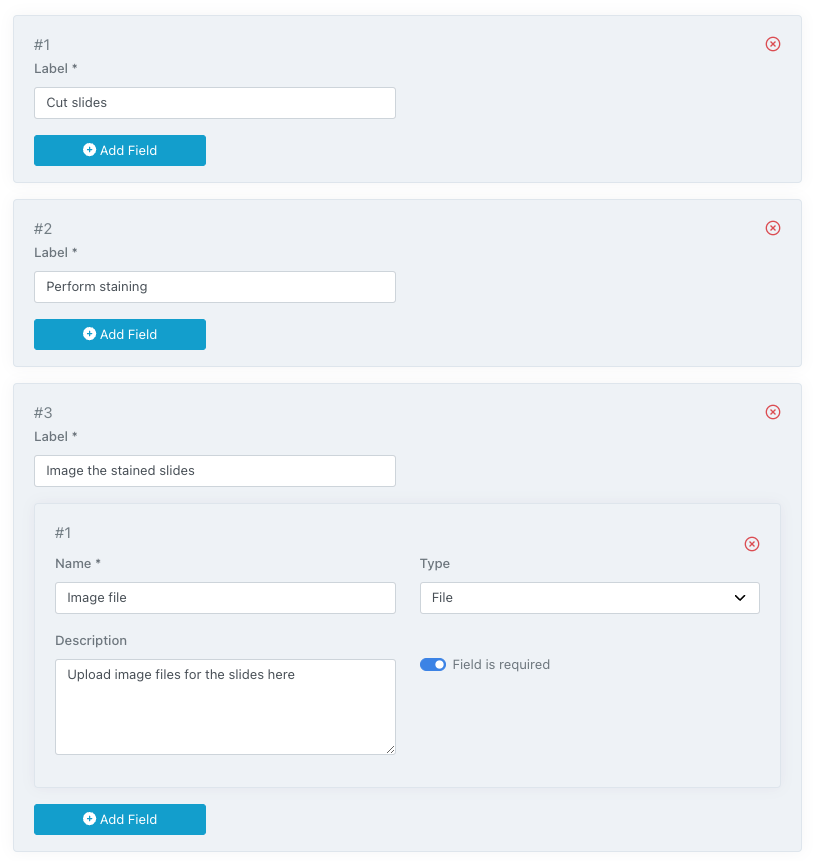 If custom fields are needed for the assay type, click 'Add Field' under the 'Input Fields' heading to create a new field card. For each input field, provide the following information: