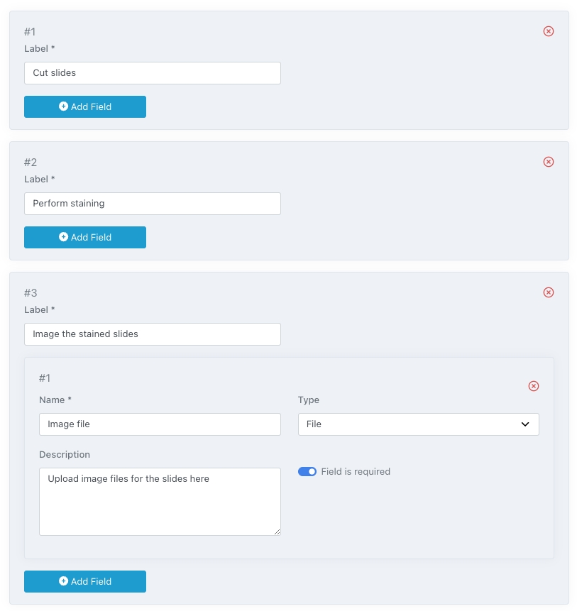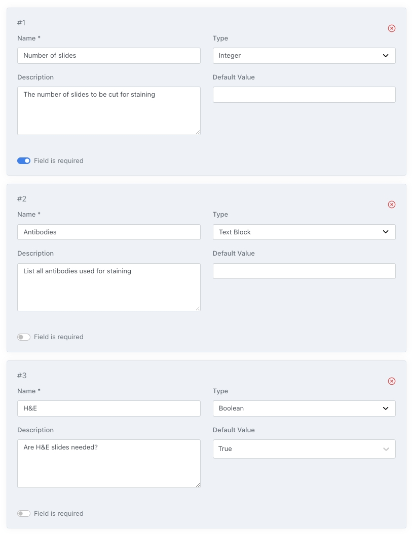 The order of each field card specifies the order the input controls will be presented to users when creating a new assay. You can change the order by dragging-and-dropping the cards.
