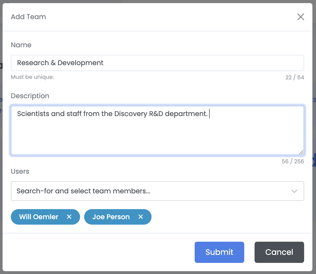 Teams are a simple way to group one-or-more users in your organization so that they can be easily assigned to projects, notes, and other resources. When a team is assigned to a resource, all of the users assigned to the team are added. Teams can be created and managed from the Admin Dashboard's Team page.