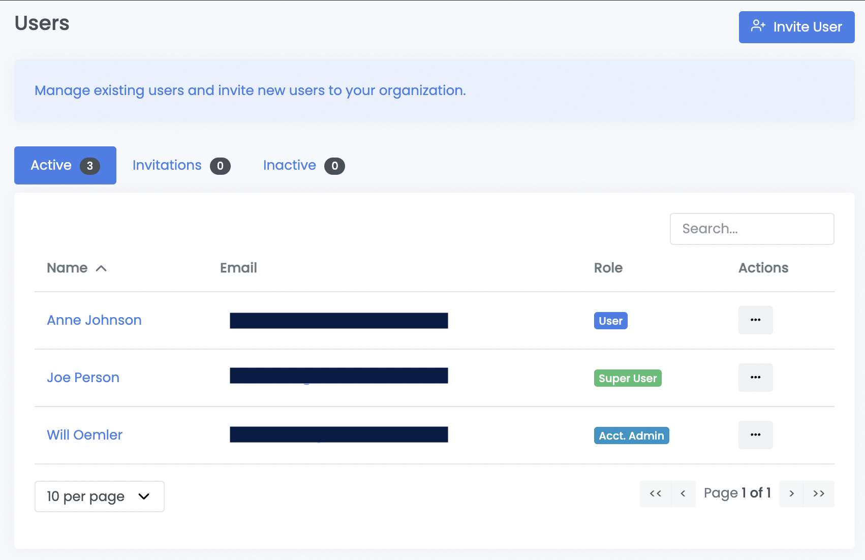 To invite a new user to your organization, click the ‘Invite User’ button in the top-right corner of the User management dashboard. Provide an email address to send the invitation to and the role you would like the user to assume. You will not be able to add the user to projects or other records until they have accepted the invitation.