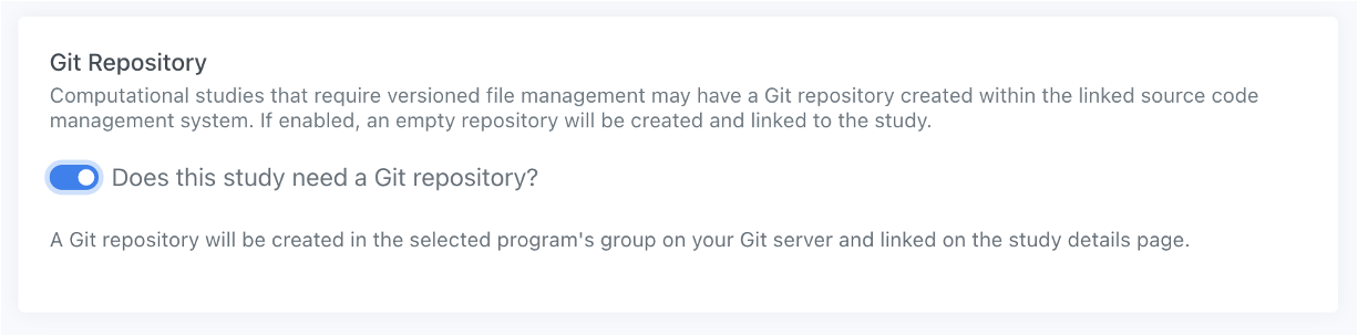 If you would like to create a source code repository for your study in a linked Git server, you can click the switch in the 'Git Repository' section to add one. This will create a repository within the Git group that was assigned to your selected program when it was initialized. If no Git group exists for the selected program, a new one will be created for it.