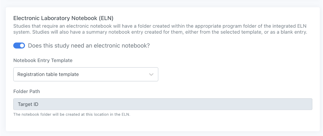 If the project you selected to associate your study with has a linked ELN project, your study will automatically receive a new ELN folder and summary notebook entry from a blank template. You can also choose to create this summary notebook entry from a registered template in your ELN system. Search-for and select the template you'd like to use from the 'Notebook Entry Template' dropdown.